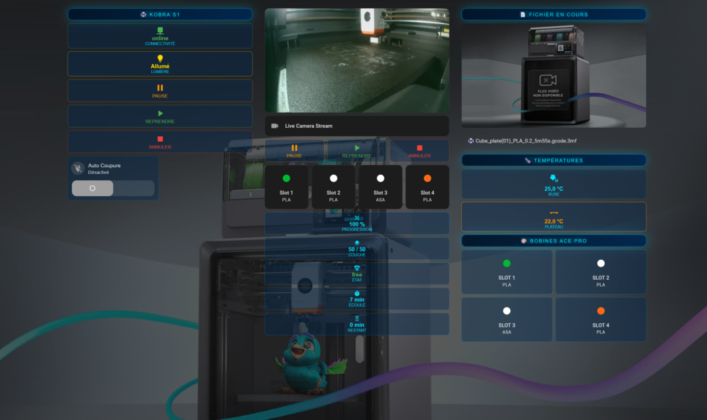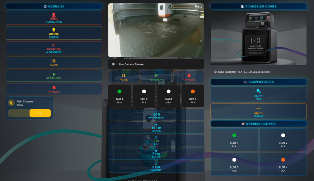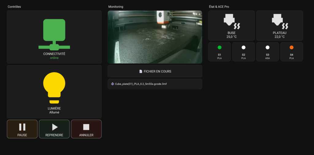Une fois l’intégration terminée, il est temps de créer une interface pour piloter votre Kobra S1. Voici le rendu visuel que nous allons obtenir (sobre, efficace et compatible avec tous les thèmes) :
