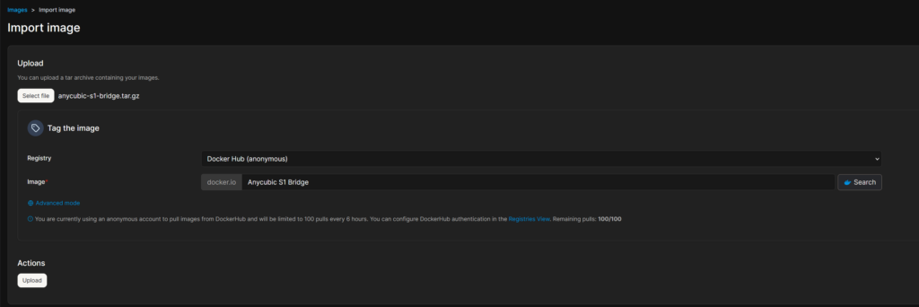 anycubic-s1-bridge.tar.gzque vous venez de télécharger. - Cliquez sur Upload. Patientez un instant… Une fois fini, vous devriez voir apparaître l’image